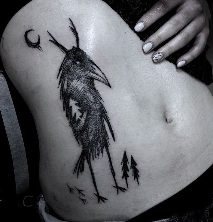 Татуировка с изображением ворона относится к числу популярных. Это связно с древними верованиями, в большинстве которых эта птица ассоциируется с темными и не очень силами. Эскиз татуировки ворон чаще всег выполняется исключительно в черно-белом исполнении, реже добавляются какие-либо цвета. Наносится такая татуировка на плечо, грудь, спину и другие части тела.