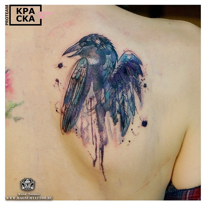 А ниже представлены фото татуировок с изображением ворона от разных мастеров.