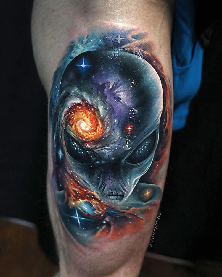 Для ценителей астрономии подойдёт татуировки с изображением космонавта. Это может быть знаменитая личность, либо же образ покорителя космоса, лица которого не видно. Те, кто верит в инопланетян, могут изображать на руке или ноге корабль НЛО, который похищает человека либо же исследует планету.