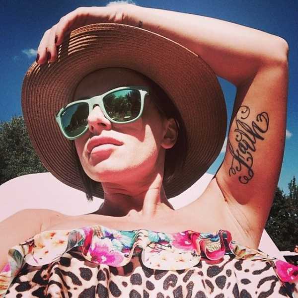 Внутренняя часть плеча левой руки оформлена большой татуировкой в виде надписи: «Faith» — Вера (англ.) В последнее время в желтой прессе было очень много публикаций, посвященных скандалам, связанным с принятием Юлии Волковой Ислама и обратный переход к Христианству. Как мы видим, артистка уделяет вопросам веры массу свободного времени и эта тату может иметь более глубокий смысл, чем может показаться на первый взгляд.