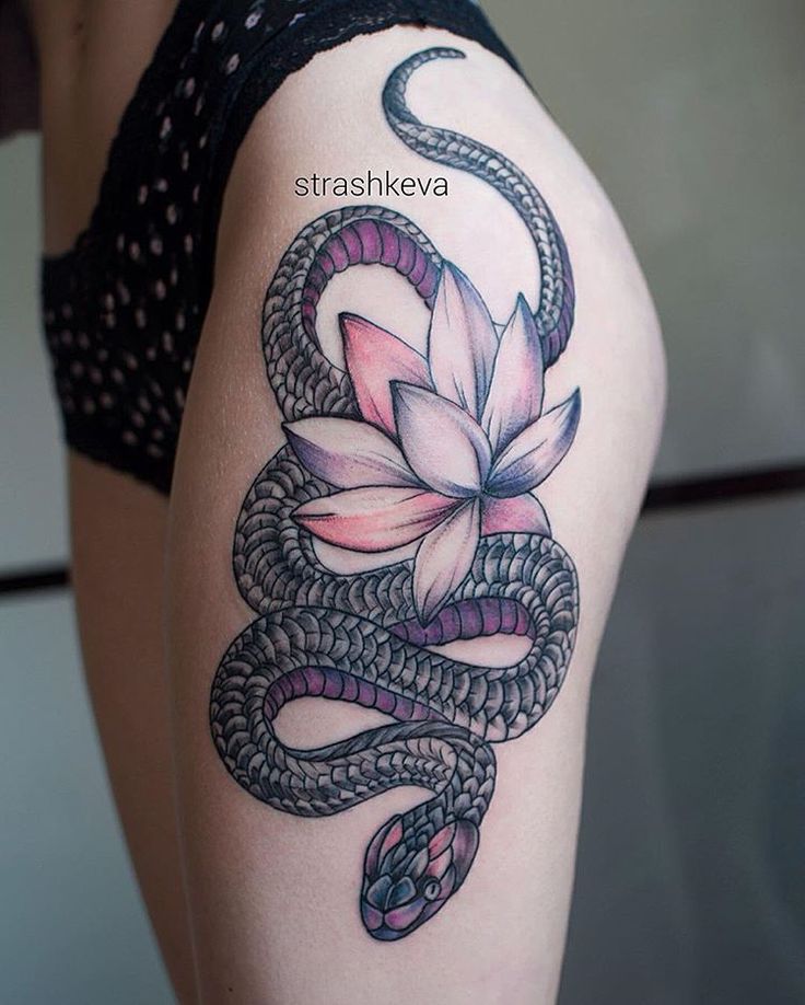 Змея – это рептилия, наводящая страх своим шипением и внешним видом, но в то же время загадочная и привлекательная. Вне зависимости от значения такой татуировки, к ней с древности относились с почтением и уважением. Даже сегодня такое тату будет оставаться символом бесконечной мудрости, сласти, тайной опасности и неудержимого искушения. Девушки чаще всего вкладывают в искушение сексуальный подтекст, ассоциируя змею с привлекательностью женского тела.