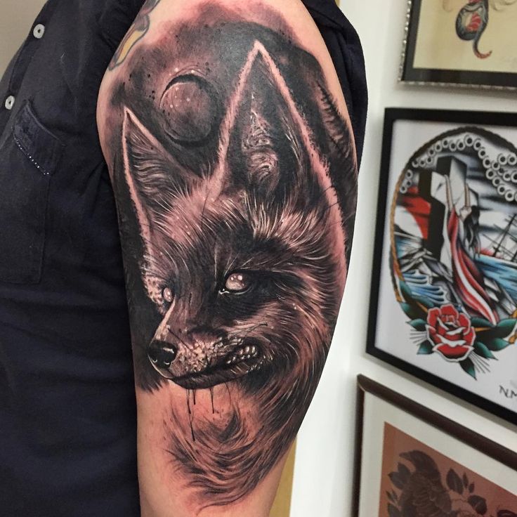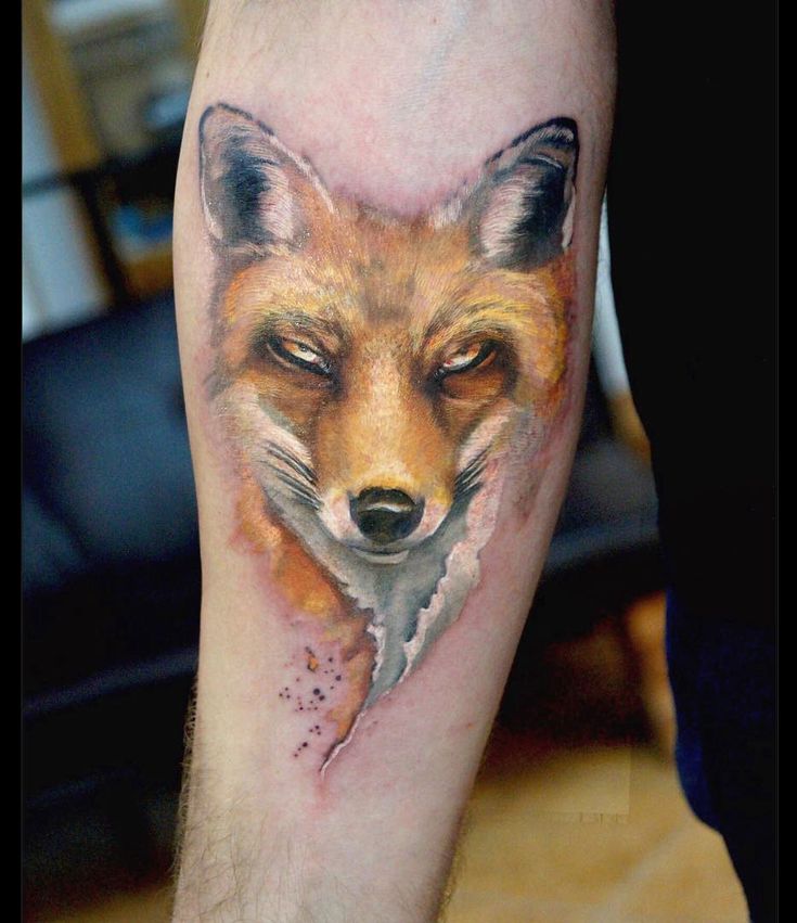 Татуировка с лисом, выполненная в реалистичном стиле.