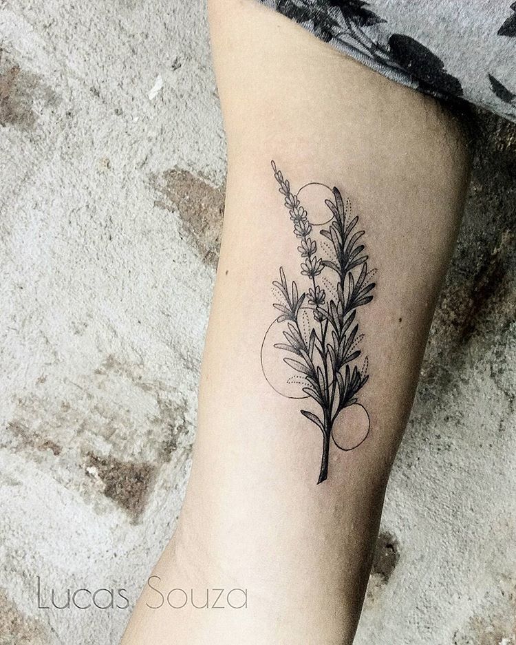 «Выбранные мной растения обладают особым целебным свойством. Для этого [клиент] пришла ко мне во время переходного периода карьеры и учебы в своей жизни и чувствовала много вины, стыда и беспокойства по этому поводу. Я выбрал садовый шалфей, чтобы помочь ей избавиться от чувства вины и стыда, и лаванду, чтобы успокоить и успокоить ее тревогу». — Сая Арриага из Silk X Tattoos