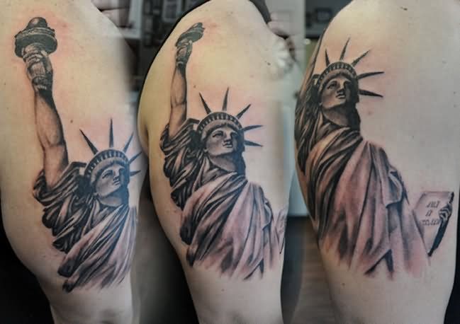 Тату знак свободы изображающий американскую статую выгодно смотрится в черно-белом стиле. Леди удачно смотрится в стилях реализм, графика, геометрия и скетч стайл. Надпись и набор символов выражающих значение тату будут броско смотреться в трэш-польке.