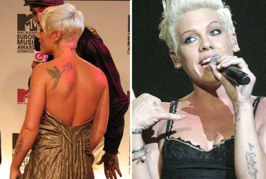Тату звезд часто символизируют значимые события в жизни. Так и татуировка Пинк на задней части шеи включает несколько важных цифр в жизни певицы. Штрихкод содержит дату рождения, день выпуска альбома «Missundaztood» и счастливый номер 13. Помимо этого изображения, певица имеет на теле звезду, ангела, бантики на ляшках и ряд надписей.