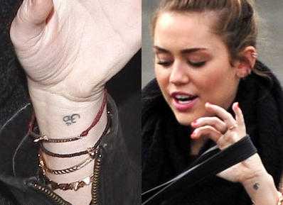 Майли Сайрус. В таком юном возрасте имеет уже семь татуировок. Вот, к примеру, одна из них – «Просто дыши», которая расположена под сердцем звезды, и « Любовь» на внутренней части ее правого уха. А также наблюдаем миленькие сердечки на правом пальце.