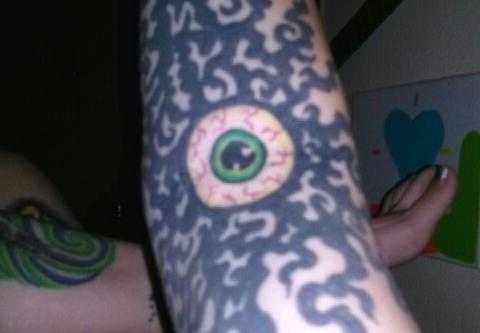 Со спины музыканта наблюдают два огромных глаза. А левая рука украшена оригинальным кружевом, которое может запросто претендовать на звание самой изысканной татуировки звезд.
