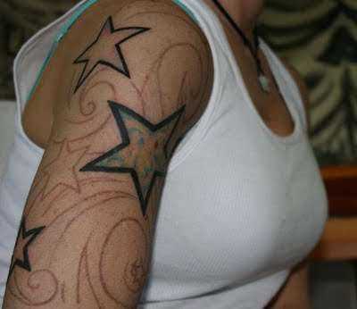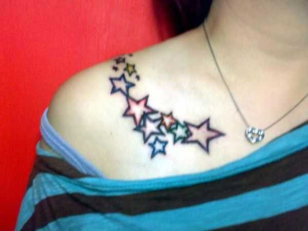 Сегодня самым популярным местом для нанесения татуировки является плечо. Это весьма выгодно, потому что такие изображения можно скрыть под одеждой, они не выгорают на солнце. Так как этот участок тела имеет выраженный контур, могут получиться очень красивыми звезды на плечах. Тату, значение которого выражается в символе власти, везучести и с
