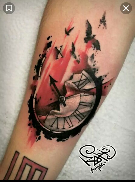 Посмотрите видео, на котором тату-мастер выполняет очень красивую татуировку часы на предплечье в акварельном стиле.