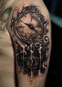 Популярно тату череп с часами обозначающее: я не боюсь смерти.