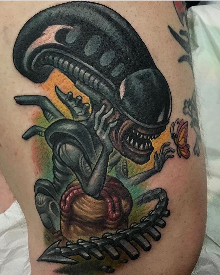 Источник: Instagram @odd_inkПродолжая тему Alien , эта идея татуировки инопланетянина показывает инкубацию младенца-инопланетянина внутри хозяина, ожидающего рождения. Завернутый, как нерожденный человеческий младенец, на данный момент инопланетянин кажется безобидным.
