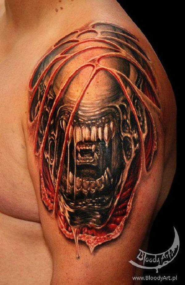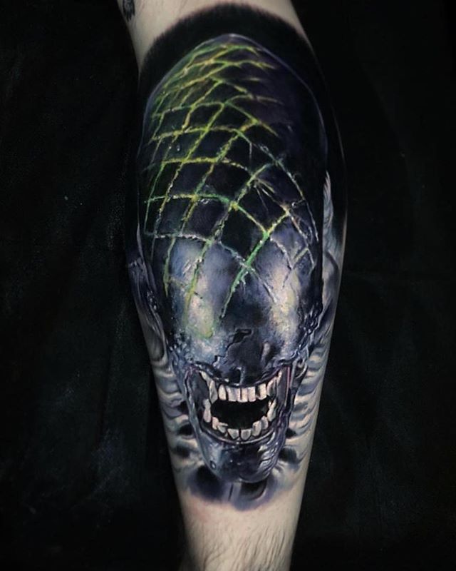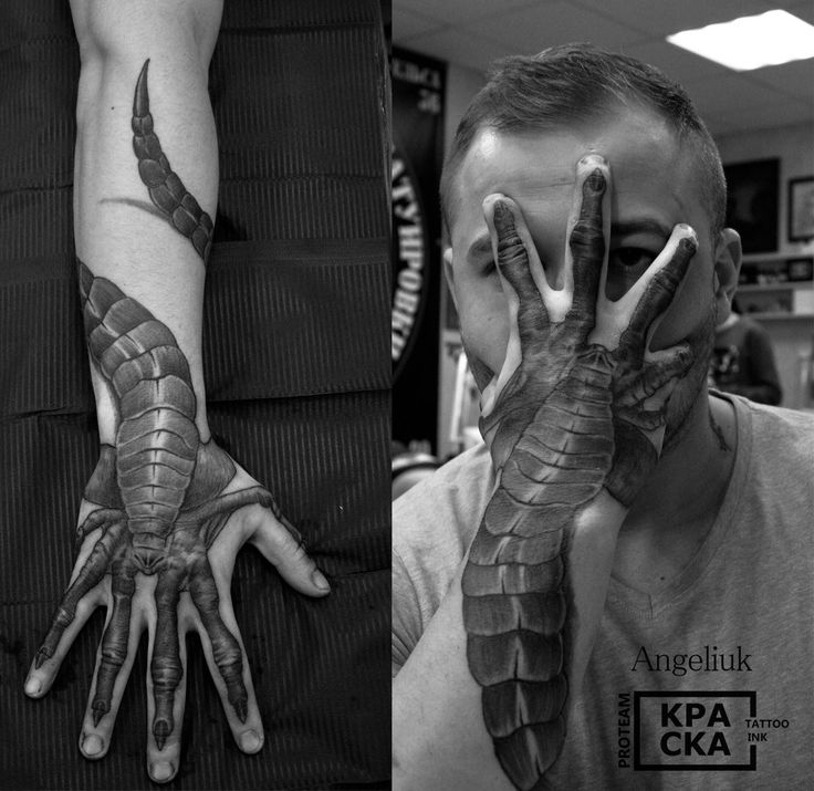 Источник: Instagram @hangwu7273В фильме «Чужой » «присоска лица» прикрепляется к жертве, чтобы внедрить потомство в хозяина, прежде чем умереть. Через некоторое время только что вылупившийся инопланетянин вырвется из хозяина, чтобы нанести ущерб своим ничего не подозревающим жертвам. Эта инопланетная татуировка изображает момент вылупления инопланетянина, выходящего из своего хозяина. Цвет, тени и кровь делают татуировку реалистичной и опасной, что соответствует темам фильмов.