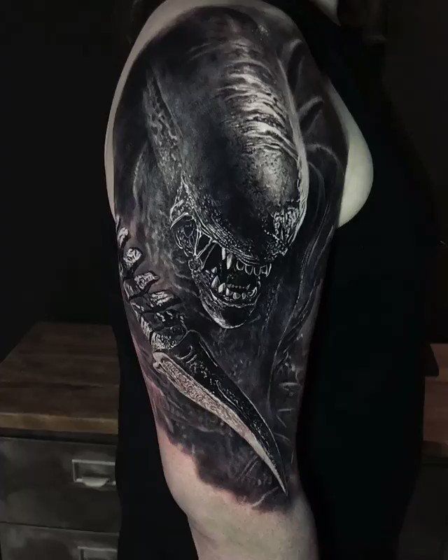 Источник: Instagram @wodirisitattooМрачная татуировка инопланетянина, на этом полном рукаве изображен угрожающий инопланетянин, чьи намерения не что иное, как плохие для Земли.