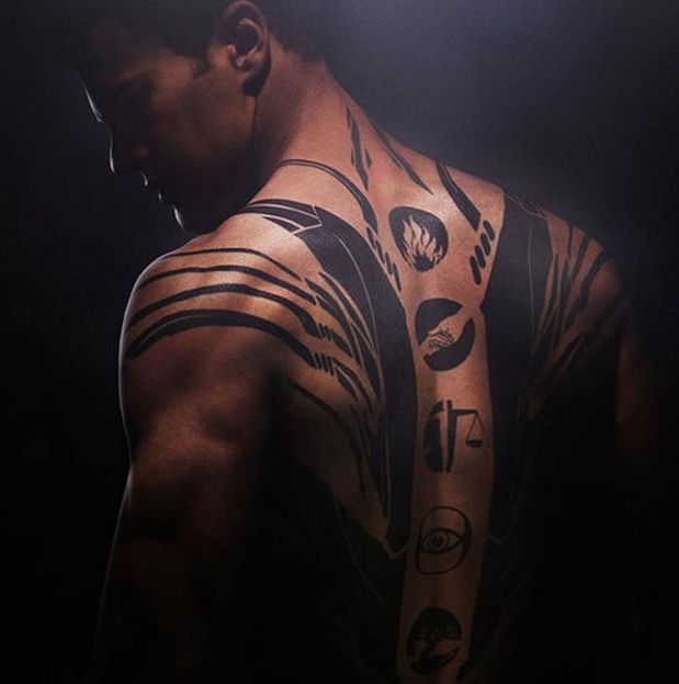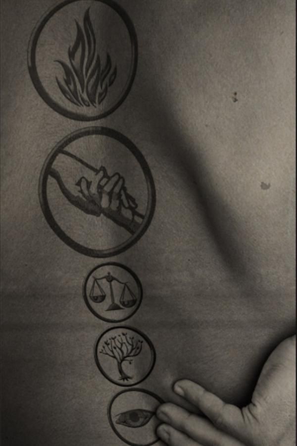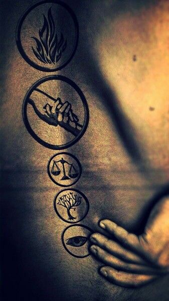 Еще одна очень часто встречающаяся татуировка «Дивергент» — татуировка, которую носит персонаж Тобиас, любовный интерес Трис в сериале. Все пять символов фракций размещены посередине спины Тобиаса вместе с другими отметинами. Это самая большая татуировка Дивергента, которую вы можете сделать, но она также имеет несколько очень крутых значений.