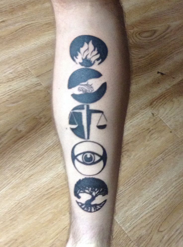 Те, кто не хочет делать татуировку одного персонажа, а вместо этого хочет представлять целую фракцию, часто получают символ(ы) фракции, который им нравится больше всего. Это отличная идея, если вы хотите точно определить конкретные значения, которые вы хотите использовать, и вместо того, чтобы делать полную татуировку Тобиаса, вместо этого вы можете получить символы Дивергента, которые значат для вас больше всего.