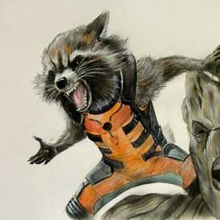 Сюжеты, связанные со “Стражами галактики” в принципе довольно популярны. Ракету в основном изображают воинственным, готовящимся к атаке, или же скорбящим по своему лучшему другу Груту.