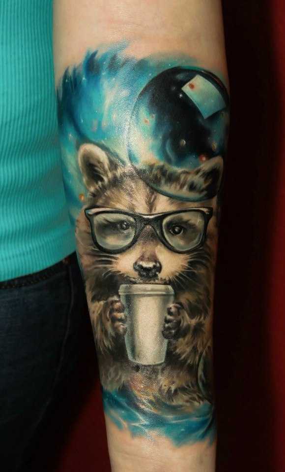 Например, тату енот на ноге или руке распространена среди американских военных, тем самым они подчеркивают силу, ум и хитрость. Однако это далеко не единственный смысл. Другая категория парней, который выбирают тату енота на руке – это те, кто, также как это животное, ведут ночной образ жизни. Не всегда речь идет о типичных «тусовщиках» – нередко выбор делают творческие личности, работающие и творящие в ночное время.