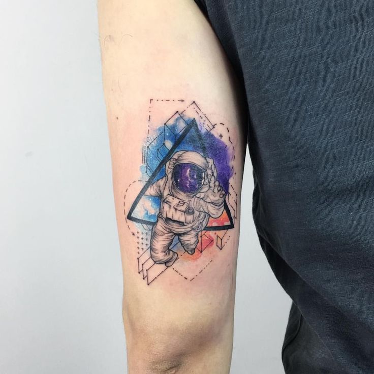 В качестве примера татуировки космонавта у нас есть это очень научно-фантастический стиль . Хотя он не закончен, видно, что он очень красочный, с подсветкой на скафандре. Отражение пространства в шлеме тоже очень интересное.