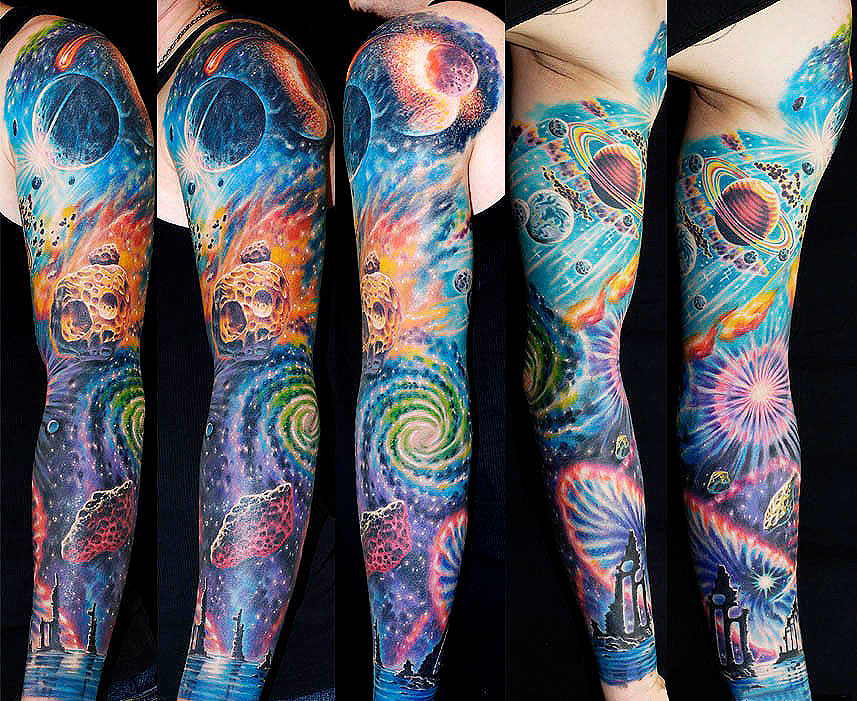 - Цветная тату с обилием планет, солнечной системы на сегодняшний день является одной из самых популярных тематик. Это объясняется тем, что вот уже пять лет как космическая тематика буквально окружает нас со всех сторон. Поэтому художники всего мира, в том числе и татуировщики, вдохновляются цветными хаотичными пятнами и компонуют их в довольно привлекательные формы. Разбавляется цветной фон темными пятнами планет и белыми бликами звезд.