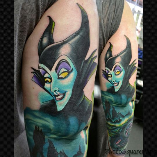 Вот несколько идей для рукавов татуировки на тему Диснея. Это портрет анимационного персонажа Диснея, которого позже сыграла Анджелина. Эта злая татуировка изображает человеческую форму, а также готовую к бою драконью форму персонажа. Яркие цвета подчеркивают интенсивность этой татуировки. Руки — лучшее место для злых татуировок такого размера.