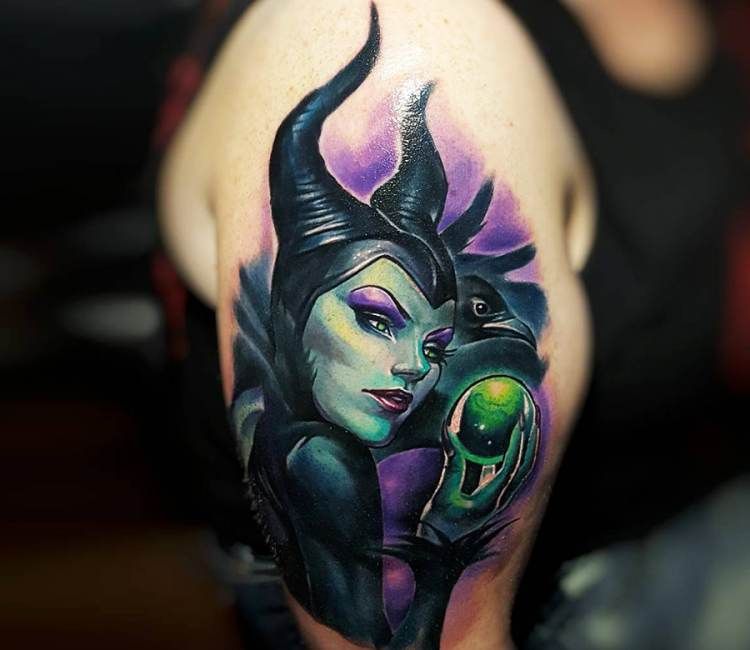 На этой злой татуировке изображена злая фея-крестная, персонаж сказки о Спящей красавице, которая появлялась в нескольких фильмах Диснея. Черный цвет всегда упоминается как отдельный цвет, это утверждение подтверждается этим богатым дизайном татуировки с черными чернилами. Кроме того, детали, переданные художниками с фиолетовым и желтым цветом, заслуживают похвалы. Этот новый дизайн татуировки лучше всего подходит для ваших рук. Вы также можете творчески оформить его вокруг ног и голени.