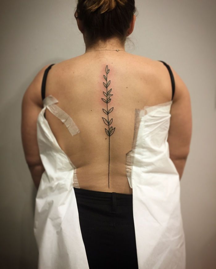 Изящные лозы выглядят так, будто выросли прямо из викторианского сада. Эта татуировка не только покрывает спину женщины, но и распространяется на ее руку. Это изысканный дизайн, который отлично подходит для покрытия большой площади минималистичным, но красивым способом.