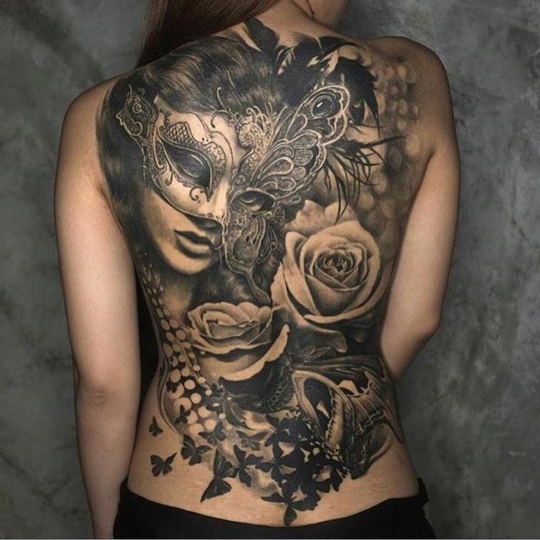 Дамам с драматическим чутьем и склонностью к театральности понравится этот великолепный дизайн с полной спиной. Все когда-то носят маску, и нет ничего лучше татуировки маскарадной маски, чтобы донести эту мысль.