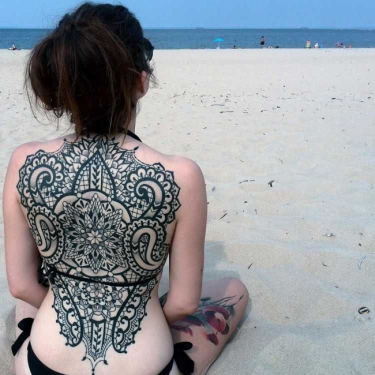 - Что касается видимости, то женские тату на спине, в отличие от мужских, также имеют ряд особенностей. Полностью показать масштабную тату женщина может на пляже. Выбрав верхнюю или нижнюю часть спины (место, где будет расположена основная часть тату или часть рисунка с наиболее значимыми элементами) можно обнажать татуировку, подбирая соответствующую одежду в летний период.