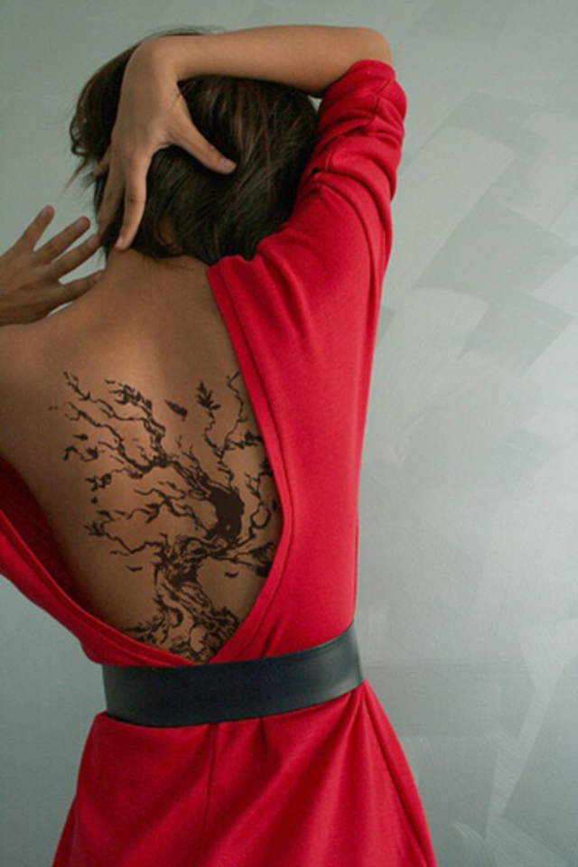 Укороченные топы, топы с глубоким вырезом на тонких бретелях или блузы с прозрачной тканью на спине. А вот в холодное время года такая татуировка практически все время будет скрыта одеждой. - Положительный момент – удобство нанесения рисунка. Работать со спиной удобно как клиенту, так и мастеру. После нанесения обработать поверхность спины самостоятельно будет практически невозможно, и к этому тоже нужно подготовиться заранее.