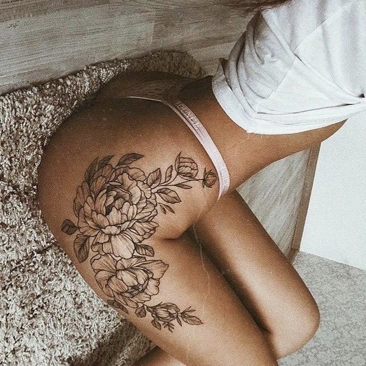 Поскольку цветочные татуировки часто имеют уникальную символику, можно безболезненно ввести их в свой арсенал, если разместить их на ягодицах. Такой привлекательный цветок, как пион, несомненно, будет отлично смотреться в качестве татуировки на попе. Цветовая гамма в дополнении к фото будет смотреться как на ладони.
