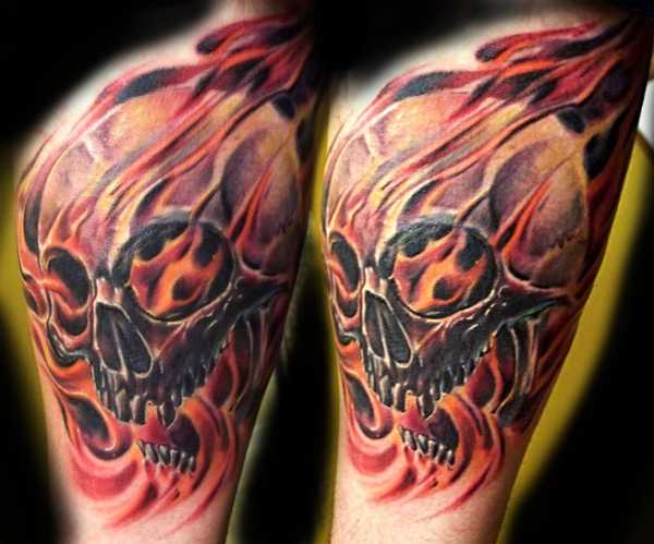 Джентльмены так же нередко запрашивают череп в огне. Тату указывает на быстротечность жизни, служит напоминанием, что нужно ценить каждый миг.