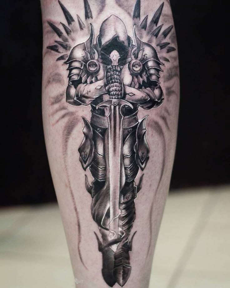 Татуировка с изображением рыцаря символизирует доблесть, честь, порядочность, смелость, мужество, стойкость, преданность, принципиальность, отвагу, храбрость, смелость, моральный кодекс.