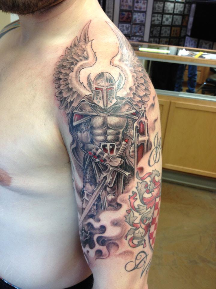 Часто сзади него изображается какой-либо замок, олицетворяющий город, охраняющийся воином. Многие под татуировкой делают подписи из рыцарских лозунгов.