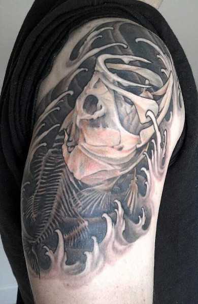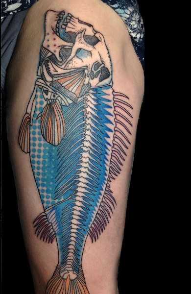 Изображение скелета в татуировках с давних пор считается самым популярным из всех символов смерти. Кости в разное время представлялись в различных религиях как символ власти, а могли просто служить украшением или оберегом, в некоторых племенах скелеты рыб были символом вечной жизни и бессмертия. Рисунок скелета рыбы на тату всегда пугал людей. Но каким бы ни был смысл, заложенный в татуировку, самое главное — это мастерство, с которым нанесена татуировка.
