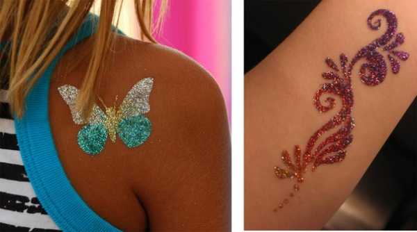 . Этот вид временных татуировок появился совсем недавно, но уже стремительно обрел популярность как в актерской среде, так и среди любителей боди-арта. Наносится цветная временная татуировка при помощи специального устройства — аэрографа, который позволяет распылять краску по телу так, что выглядит это очень реалистично: невооруженным глазом и не разглядеть настоящая это тату или нет. Краски для аэротату используются силиконовые, это означает, что такой рисунок может продержаться после нанесения достаточно долго — до 1 недели. Затем он постепенно смывается. Именно поэтому этот вид боди-арта относят к категории смывающихся татуировок. - Глиттер-тату. Это рисунок, выполненный при помощи блесток, которые закрепляют на коже специальным клеем. Любой уважающий себя салон красоты способен предоставить эту услугу для представительниц прекрасного пола. Эти привлекательные рисунки блестками также можно отнести к смываемым татуировкам. Держатся они около 7 дней (если слишком активно не тереть их мочалкой).