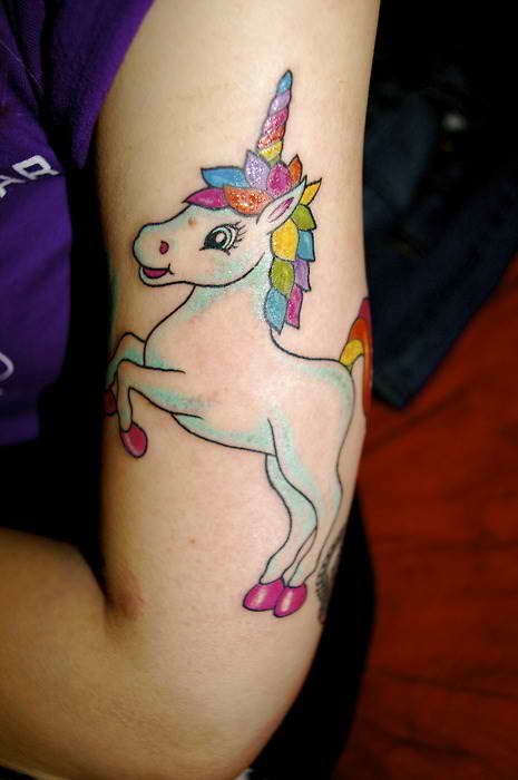Эти изделия отдают дань уважения целомудренному изображению единорога. С мультяшными татуировками единорога есть возможность причудливых вариаций классического изображения единорога, и эти татуировки обычно указывают на возраст невинности человека, который их носит. Мультяшные татуировки единорога, как правило, «девчачья штучка», поскольку не так много мужчин (гетеросексуальных или нет), которые готовы ходить с изображением розового единорога на своем теле.