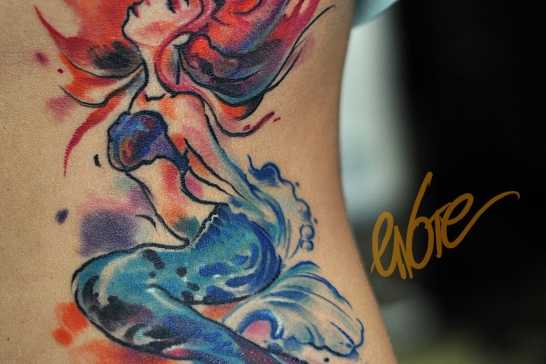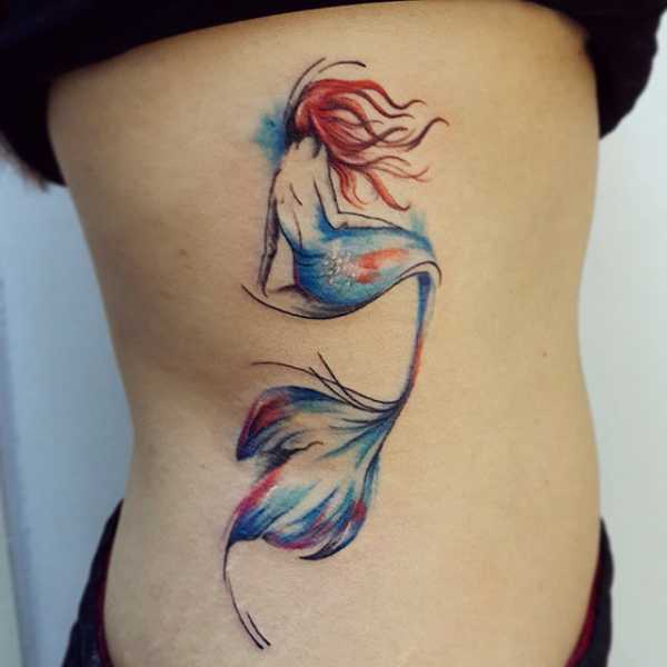 Татуировка с русалкой в технике акварель выглядит очень красиво как на нежном женском, так и на сильном мужском теле.