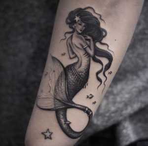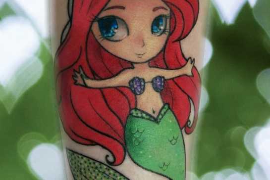 Кроме «абстрактных» русалок на татуировках можно увидеть героиню диснеевского мультфильма Ариэль. Такой нательный рисунок не обладает глубоким смыслом, но он может означать, что человек находит что-то общее между собой и озорной подводной принцессой, симпатизируют ее чертам характера и внешности.