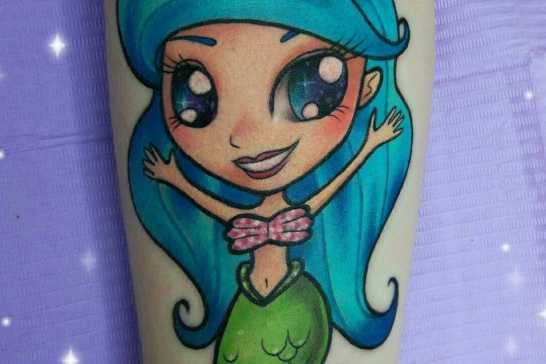 - Не стоит забывать, что есть и мультяшные русалочки. К примеру, та же Ариэль. Чтобы стать обладательницей такого детского рисунка, на самом то деле, нужна не абы какая смелость! Зато эффектность такой татуировке гарантирована.