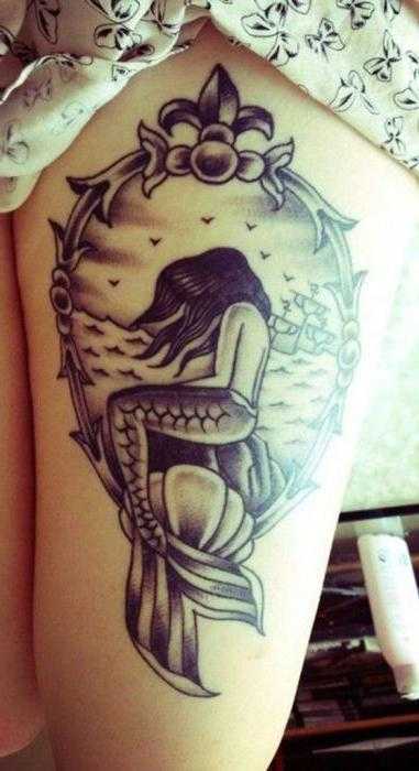 Интересно, что в числе первых тату с изображением русалок начали делать моряки. Одна в море или же на большом камне она будет олицетворять свободу и удачу. Изображенная прикованная к якорю русалка будет олицетворять разочарование и потерю самого важного в жизни. Чаще подобные татуировки выбирают женщины. Для них такие рисунки означают некий намек на сексуальность, а также желание подчинять своей привлекательностью мужчин.