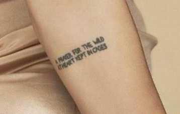 На левой руке цитата из Теннеси Уильямса: «Молитва за диких сердцем, которых держат в клетках». Эта фраза расположена на фоне китайского иероглифа «смелость».