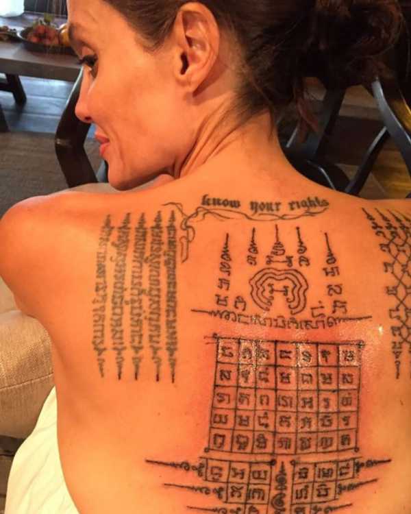На фото: Тату на пояснице Анджелины ДжолиПоследние татуировки Анджелины Джоли делал тайский монах Аджарн Ну Кэнпай. Который ради этого дела прилетел специально из Бангкока. Эскиз, который он предложил актрисе, планировал набивать и ее бывший муж Брэд Питт, чтобы помочь возлюбленным восстановить семейную идиллия и наладить отношения. Для набивания тату использовалась специальная хирургическая игла. Процесс становился более болезненным, зато точность нанесения изображения увеличивалась в разы.