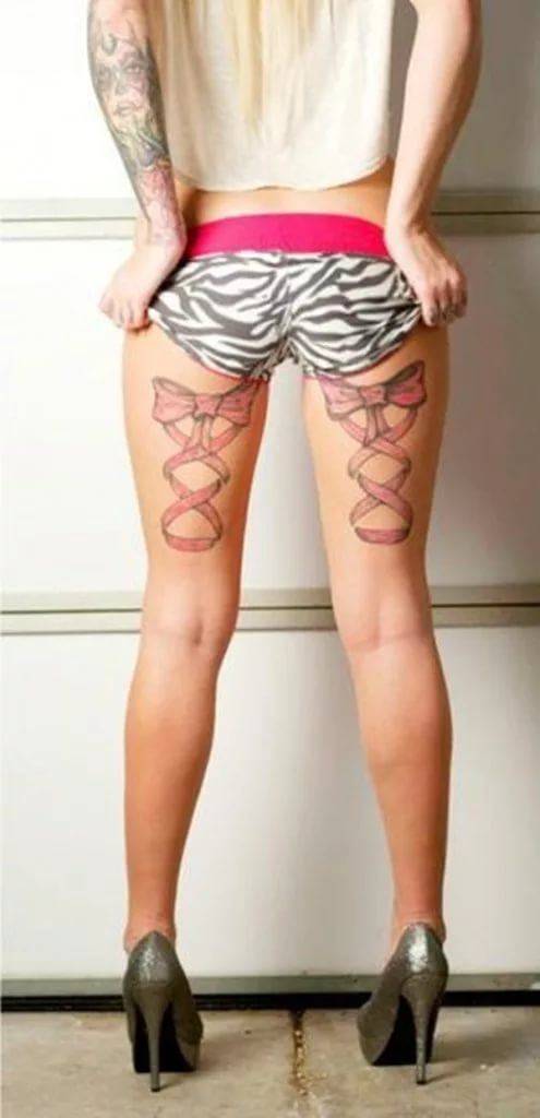 Татуировка в виде банта на бедре может быть очень привлекательной.