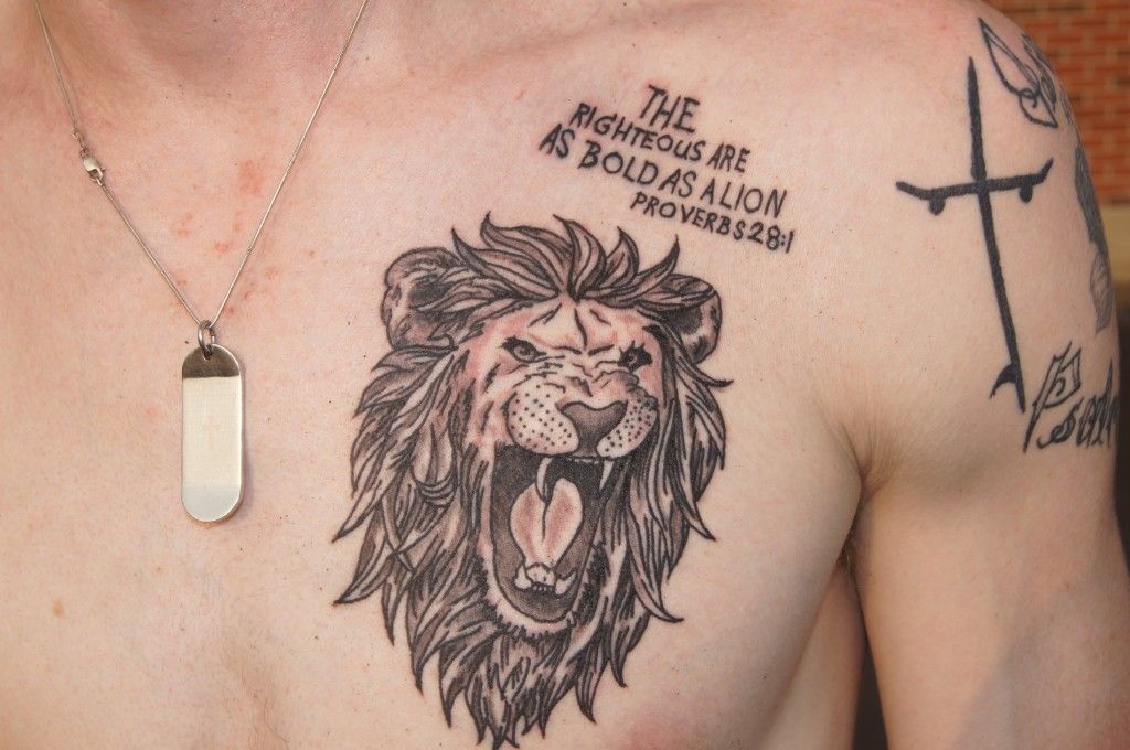 Украшая грудь тату, представители сильного пола чаще всего обладают смелостью, решительностью и уверенностью в себе. Эти черты четко подтверждают образы животных, символические надписи и канонические орнаменты на разных частях тела.