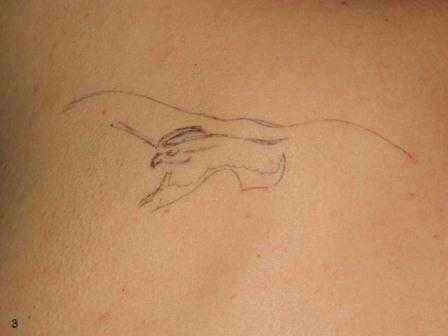 3. Теперь переходим непосредственно к рисованию. Сначала нужно нарисовать рисунок на теле. Для этой работы используйте специальную ручку для тату или же обычную чёрную гелиевую. Если вы не умеете рисовать, можно купить в специальном салоне по продаже принадлежностей для тату подходящий трафарет для рисунка.