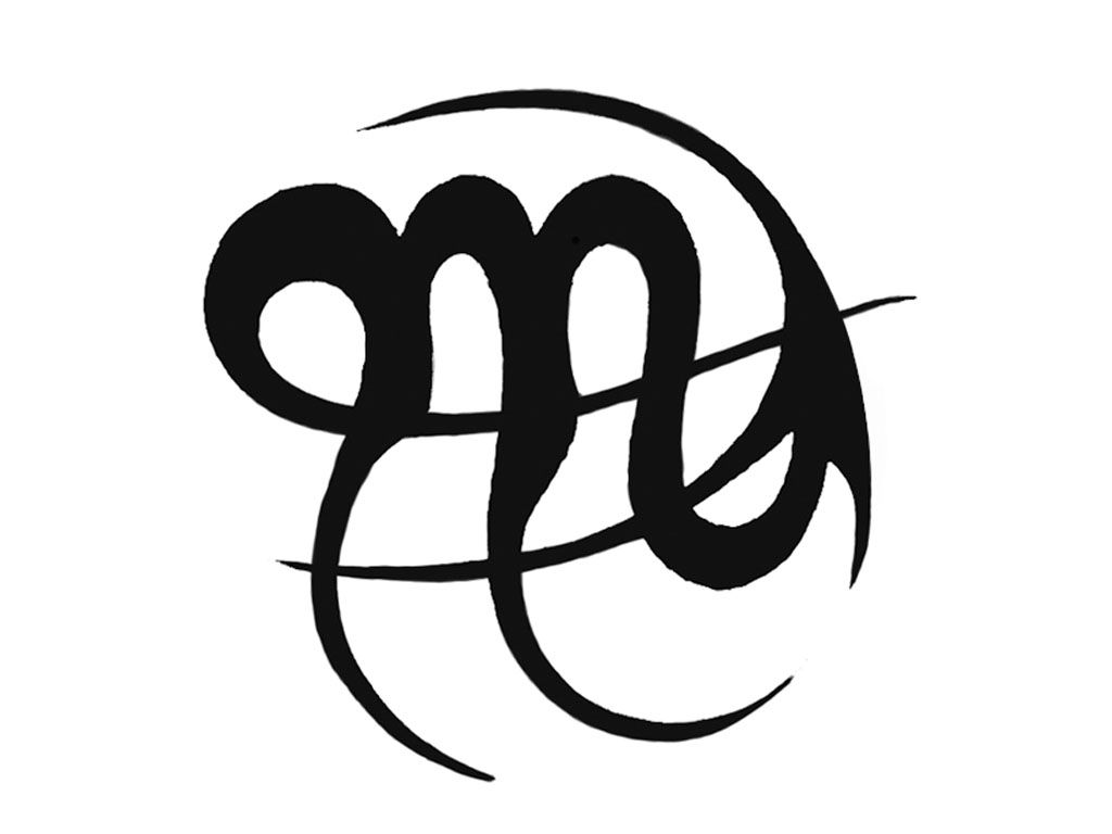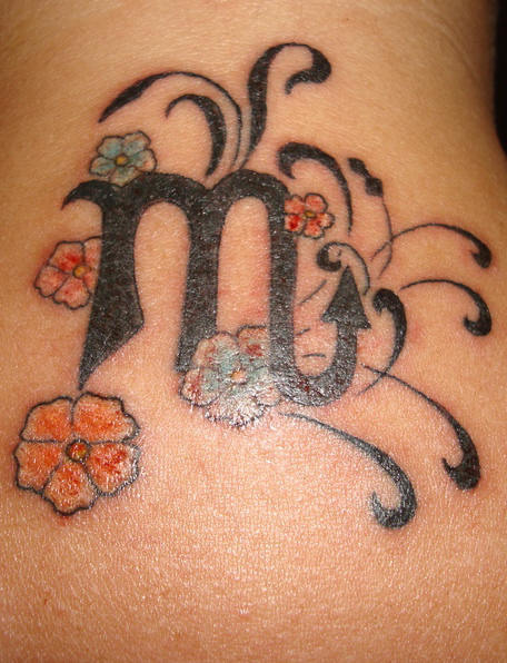 Символом созвездия Скорпиона принято считать букву «m», которая изображается с поднятой вверх или направленной вниз стрелой. Эскиз такого характера оформляется в виде одиночного рисунка или в качестве дополнения более сложных композиций. Татуировка символ отличается небольшими размерами, что позволяет наносить её на любую часть тела и может по желанию дополняться абстрактными рисунками, геометрическими фигурами, флористическими элементами, звёздами и другими деталями.![]()