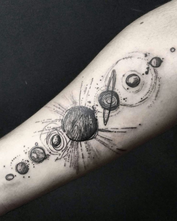 Большинство людей думают о планетах, когда говорят о космосе. Самое замечательное в этих татуировках то, что вы можете сделать луну, землю и любую другую планету, которую захотите. На этой удивительной татуировке даже есть космонавт. Иногда татуировка черными чернилами может быть таким боди-артом.