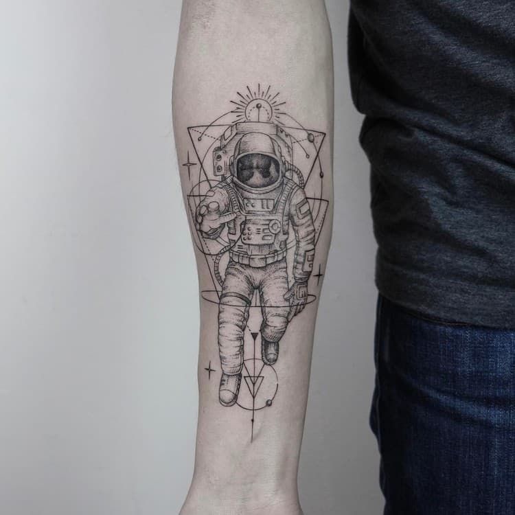 Космонавты — это те, кто путешествует с Земли в космос. Если вы хотите татуировку, которая покажет вашу любовь ко вселенной и вашу страсть к путешествиям, то что может быть лучше, чем сделать татуировку космонавта? Эти татуировки можно сделать на плече, так как вы можете попросить своего художника сделать их такими большими или маленькими, как вы хотите. Кроме того, вы можете сделать детали позади космонавта, такие как ночное небо или просто космос в целом.