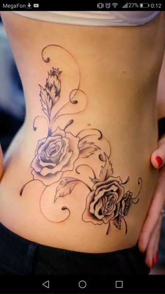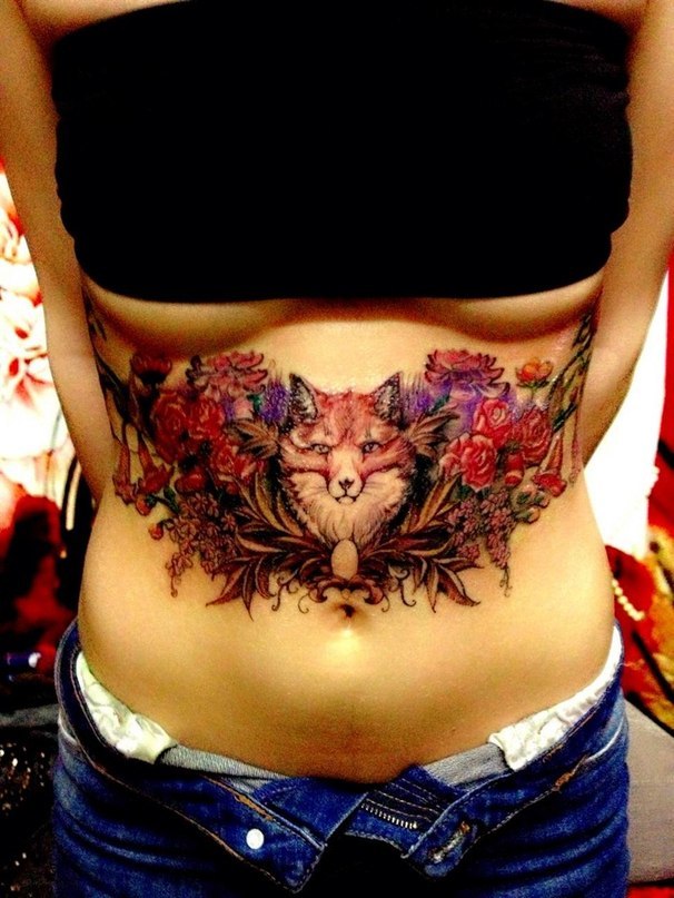 - В правой или левой верхней части живота. Чаще всего это комбинации из цветов, узоров, изображения животных. Татуировка может быть как небольшой, так и крупной. В этом месте кожа наименее подвержена деформации.