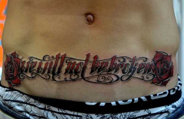 Также многие наносят татуировки в зоне пресса или внизу живота. Обычно это спортсменки, девушки, занимающиеся танцами. Татуировки на животе очень распространены и поэтому чтобы не утратить свою уникальность придумайте свой эскиз, обезопасив себя таким образом от потрясения, увидев когда-нибудь точную копию вашего изображения.